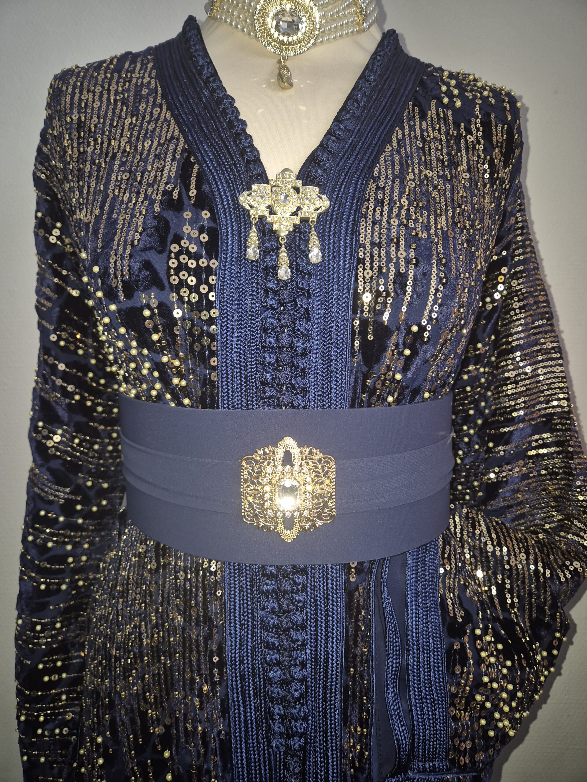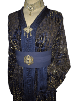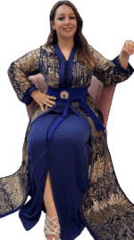 Laat je betoveren door de tijdloze elegantie van deze prachtige Marokkaanse takchita, met de hand afgewerkt met fijne pailletten en glinsterende kraaltjes. De jurk straalt luxe en vrouwelijkheid uit, dankzij de rijk gedecoreerde borstpartij, subtiele borduursels en vloeiende lagen stof die bij elke beweging zacht meebewegen.
