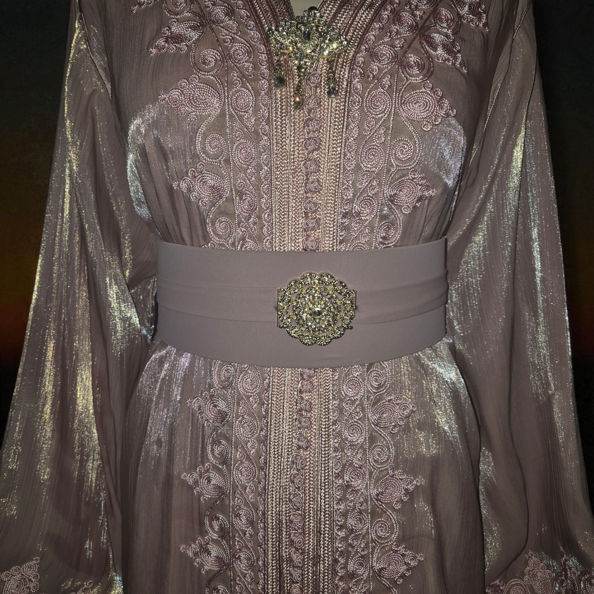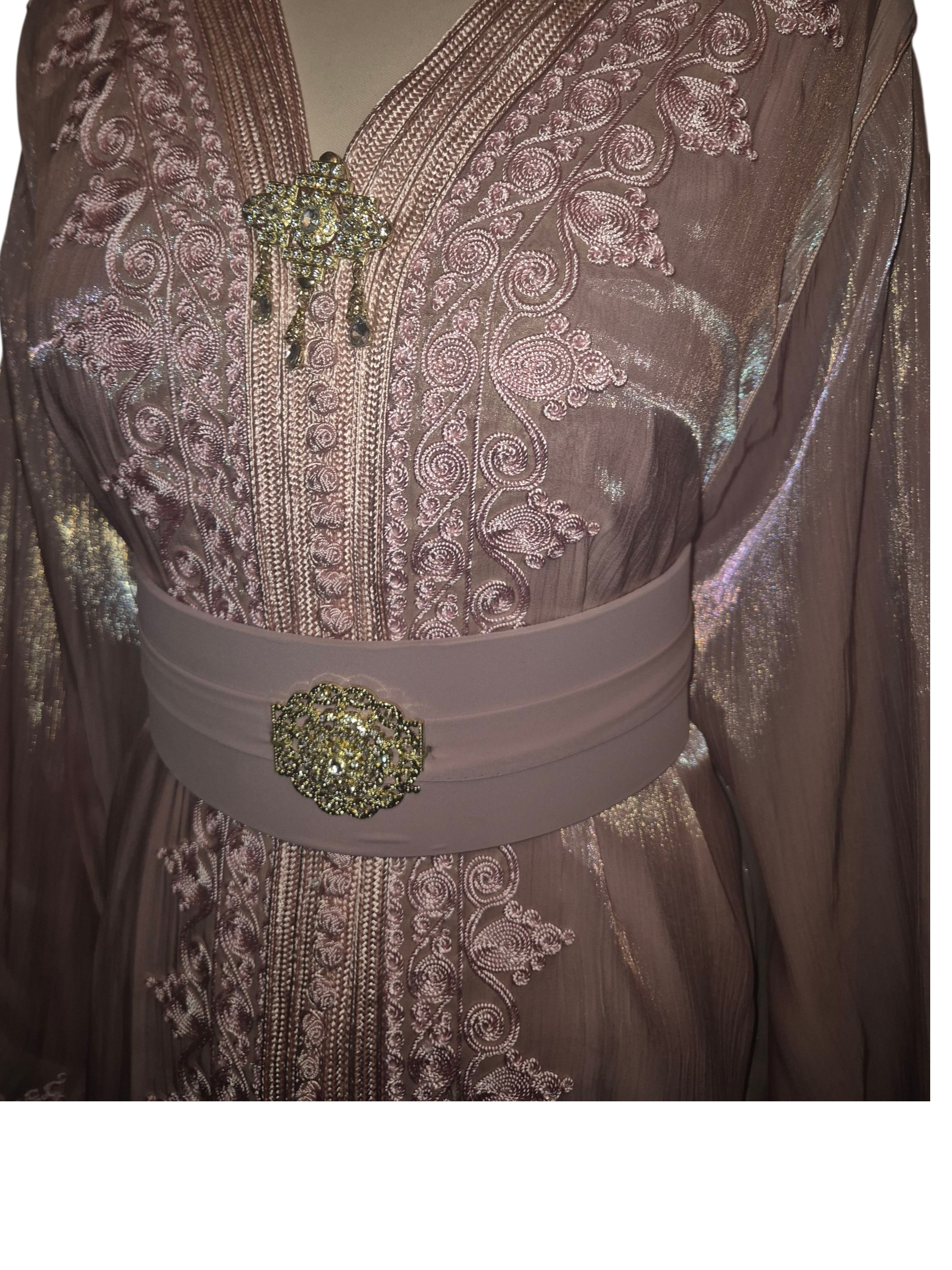 Deze betoverende takchita straalt pure elegantie uit in zachte lila en roze tinten. Gemaakt van luchtige organza die subtiel glanst bij elke beweging, geeft deze jurk een sprookjesachtige uitstraling.