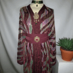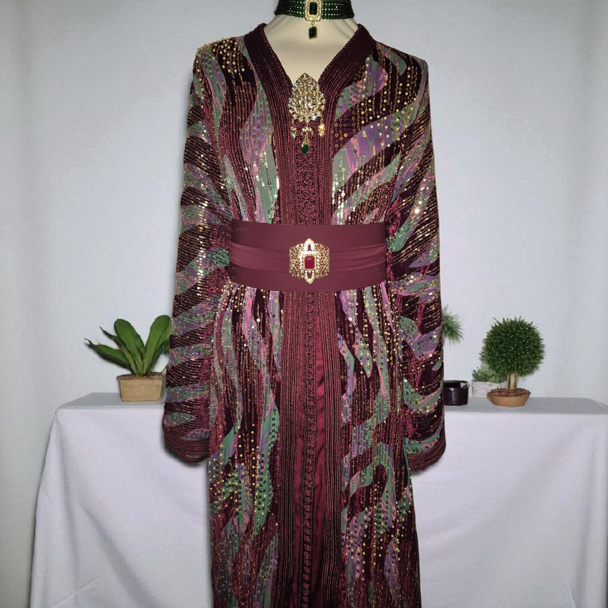 Laat je betoveren door de pracht van deze bordeauxrode en groene Marokkaanse takchita, een waar kunstwerk van elegantie en vakmanschap.