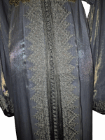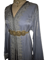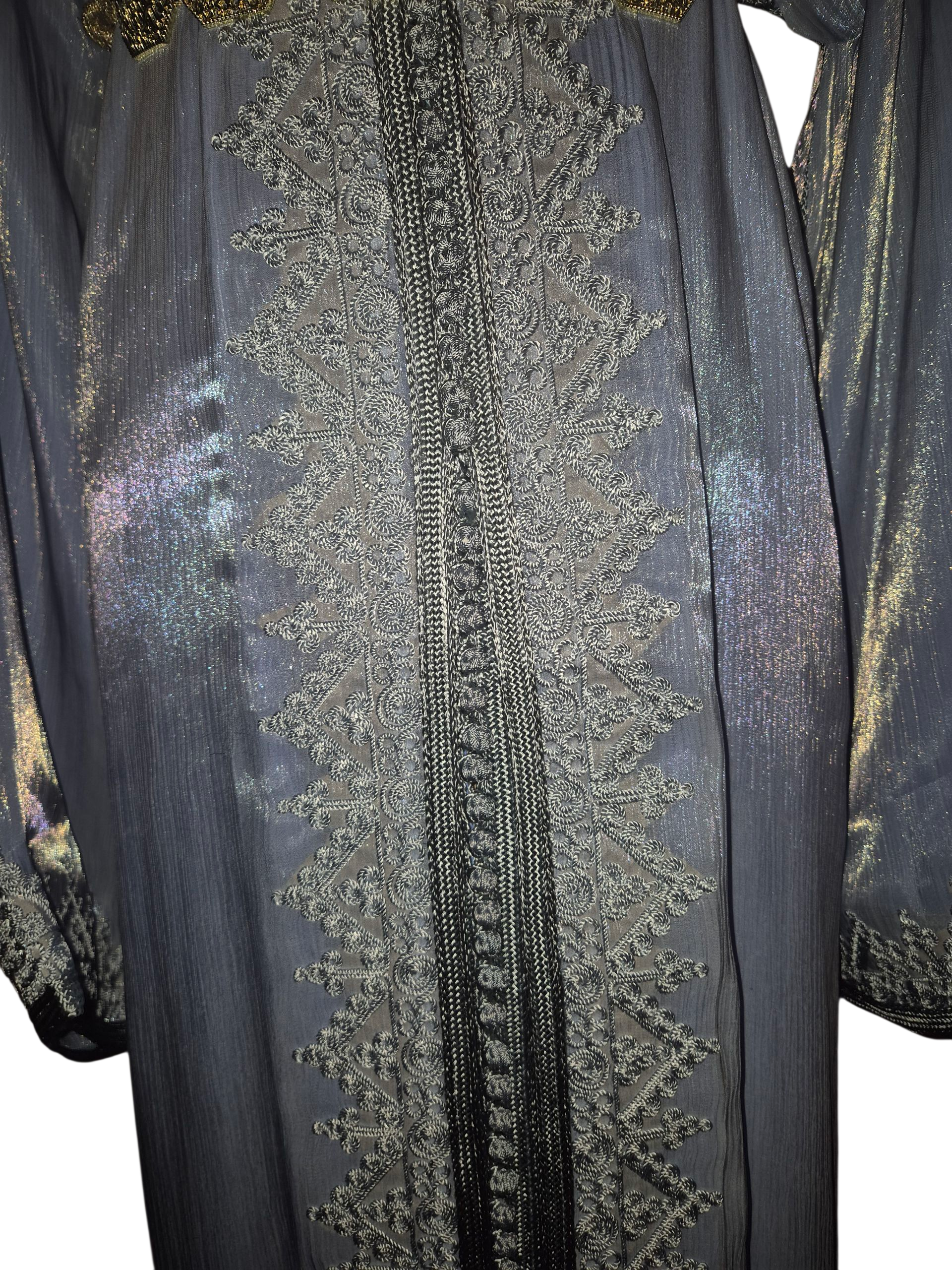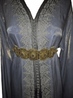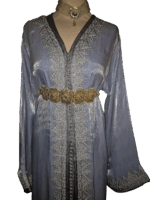 Deze adembenemende Marokkaanse takchita is een ware ode aan vrouwelijkheid en traditie. Gemaakt van luxueuze organza in een zachte lichtblauwe tint, straalt ze zowel verfijning als zachtheid uit. De jurk is rijk afgewerkt met fijne borduursels,met de hand vervaardigde details die het ambacht van Marokkaanse couture weerspiegelen.