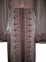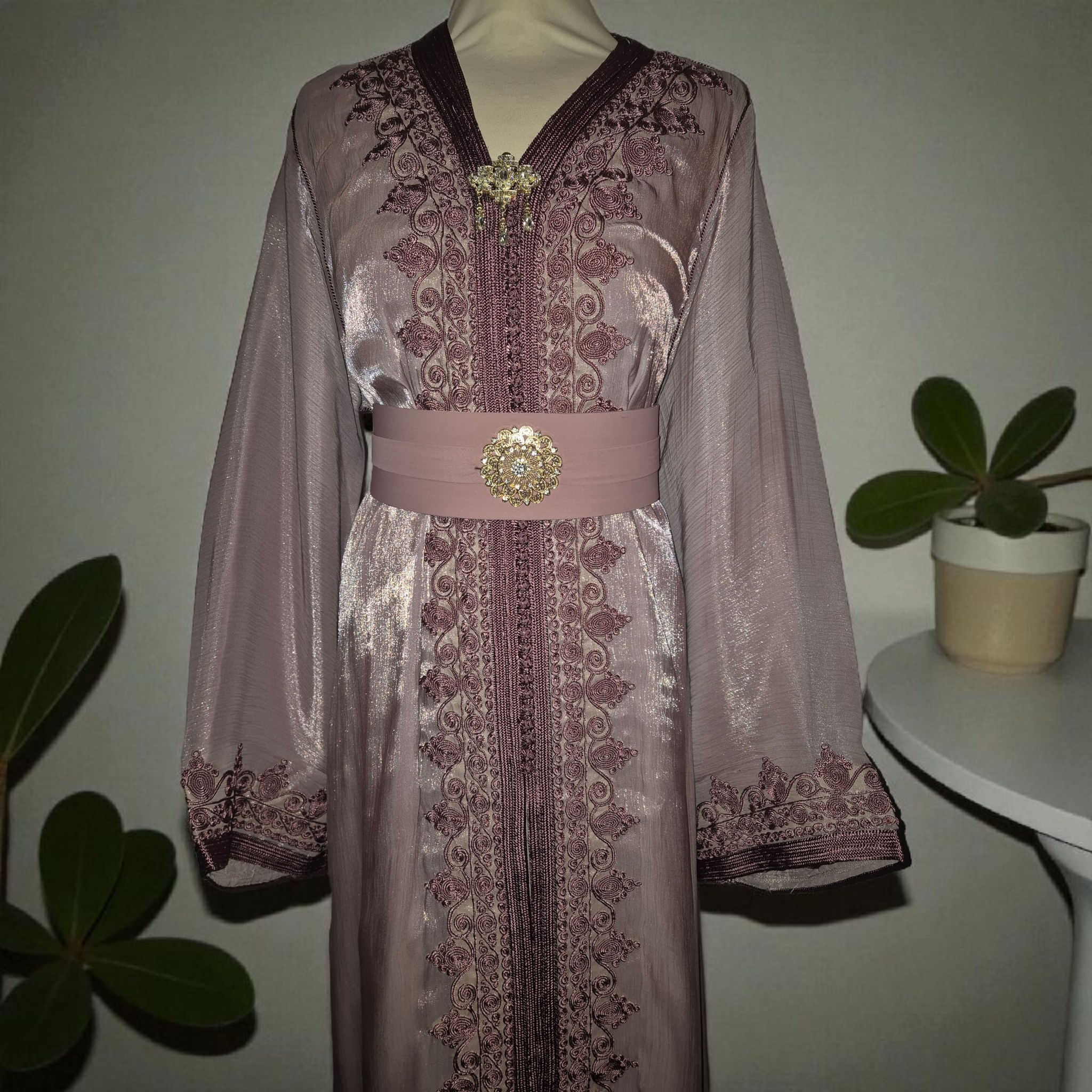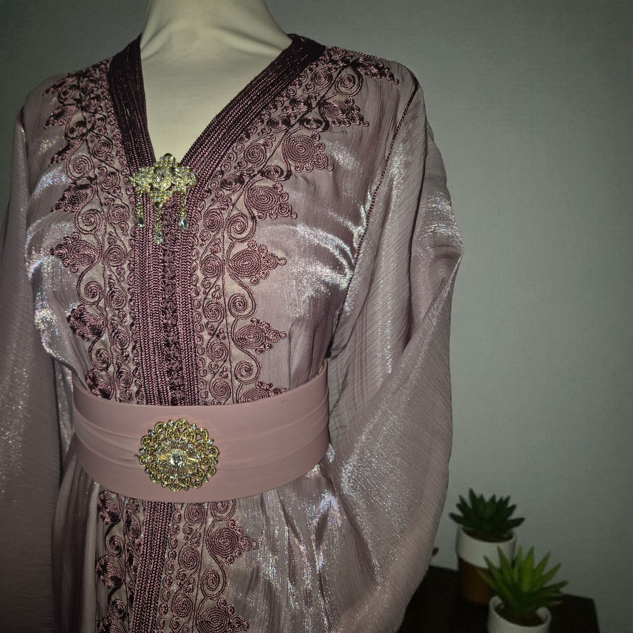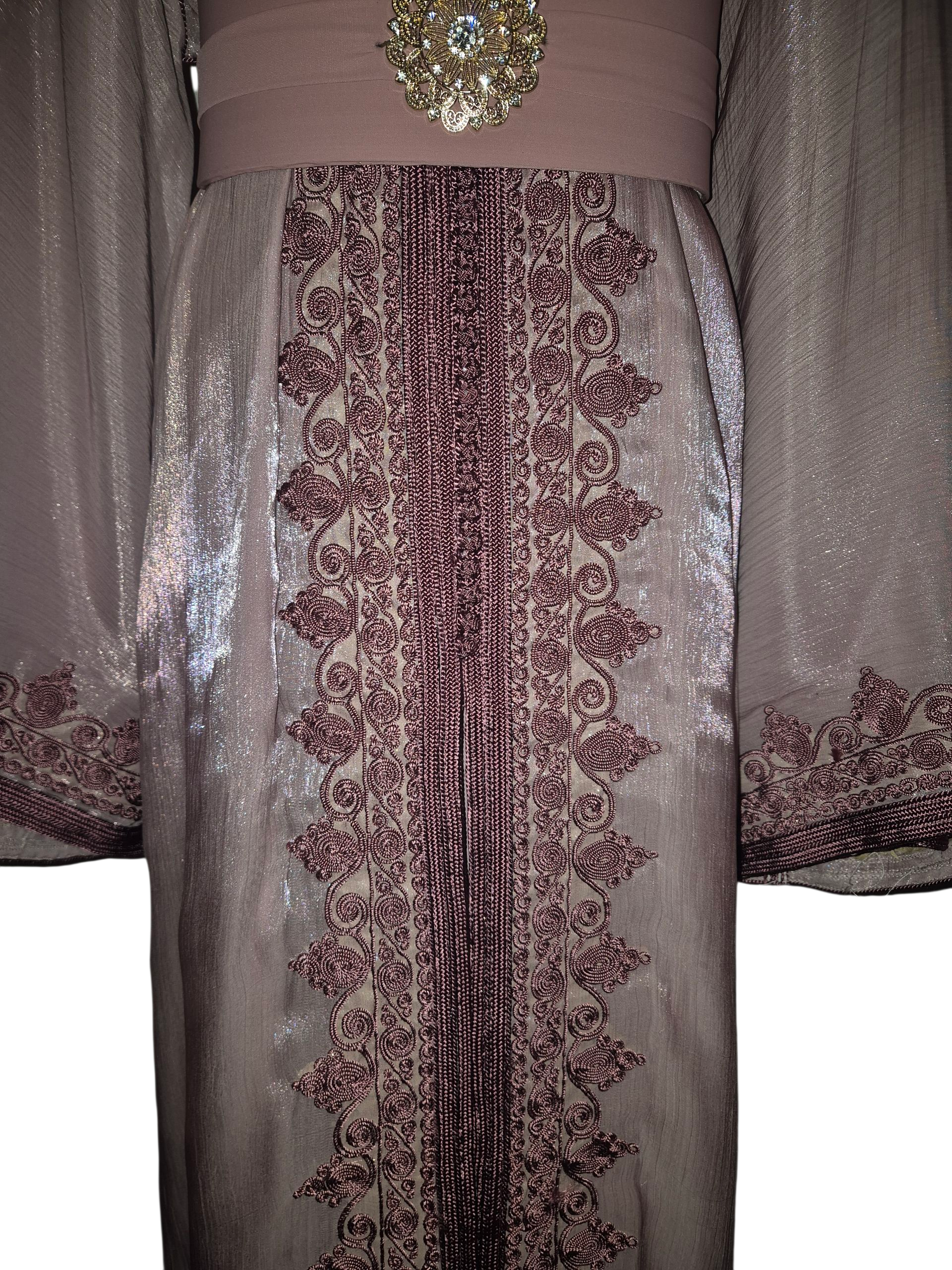 Laat je betoveren door de charme van deze lila-paarse takchitajurk, een waar kunstwerk van elegantie en traditie. De luchtige organza stof vangt het licht op bij elke beweging, waardoor de jurk een zachte, glinsterende uitstraling krijgt.