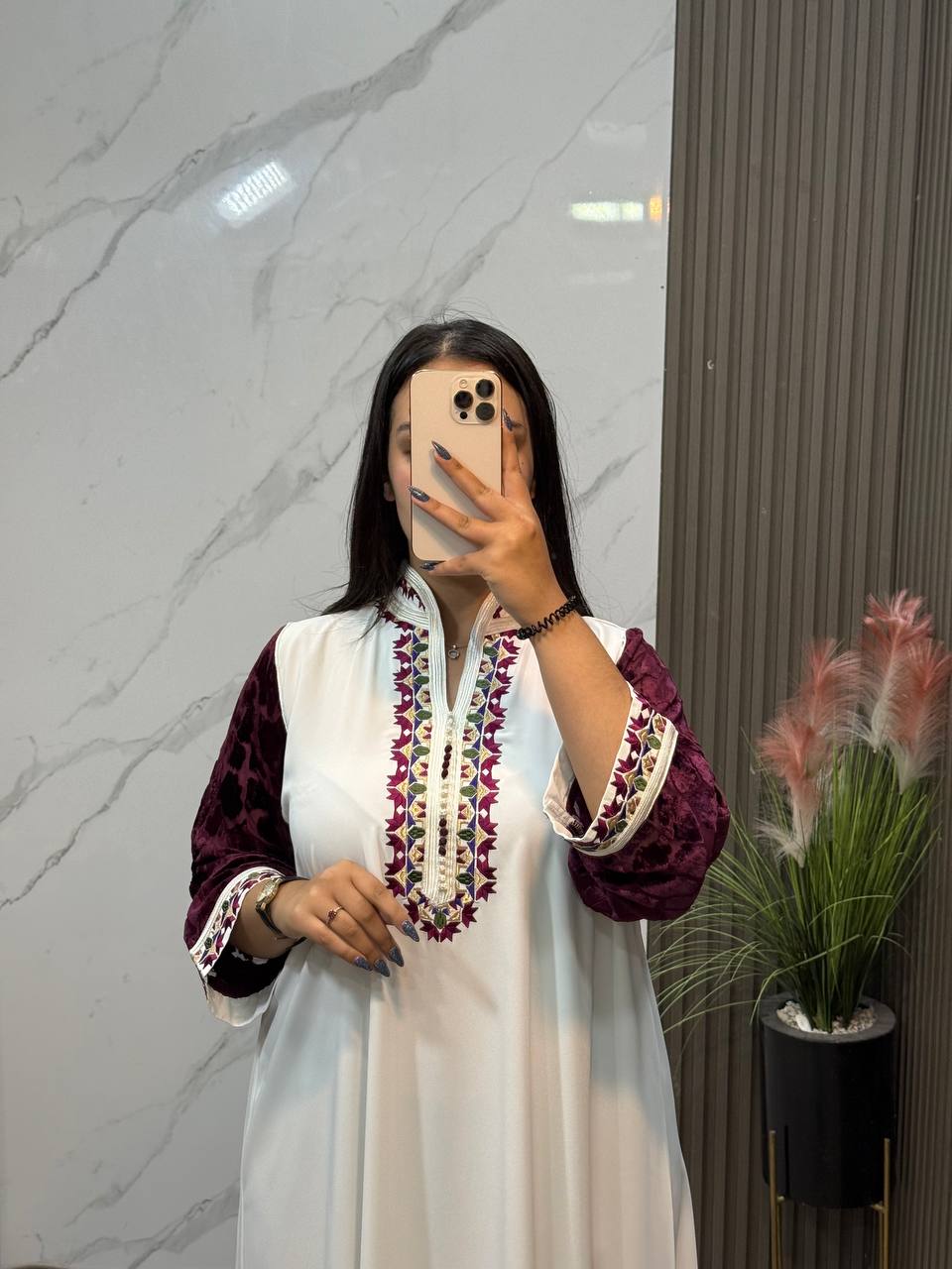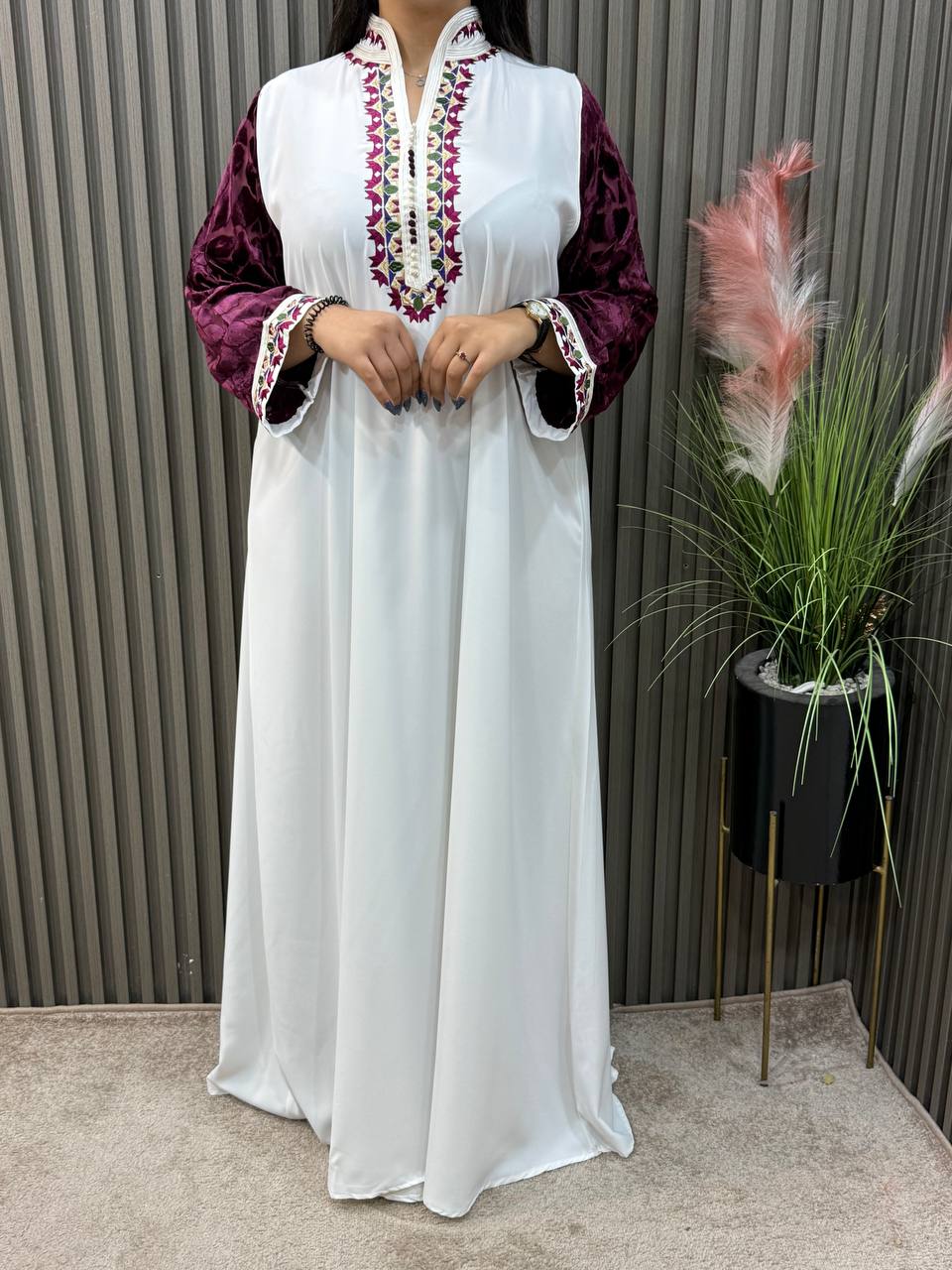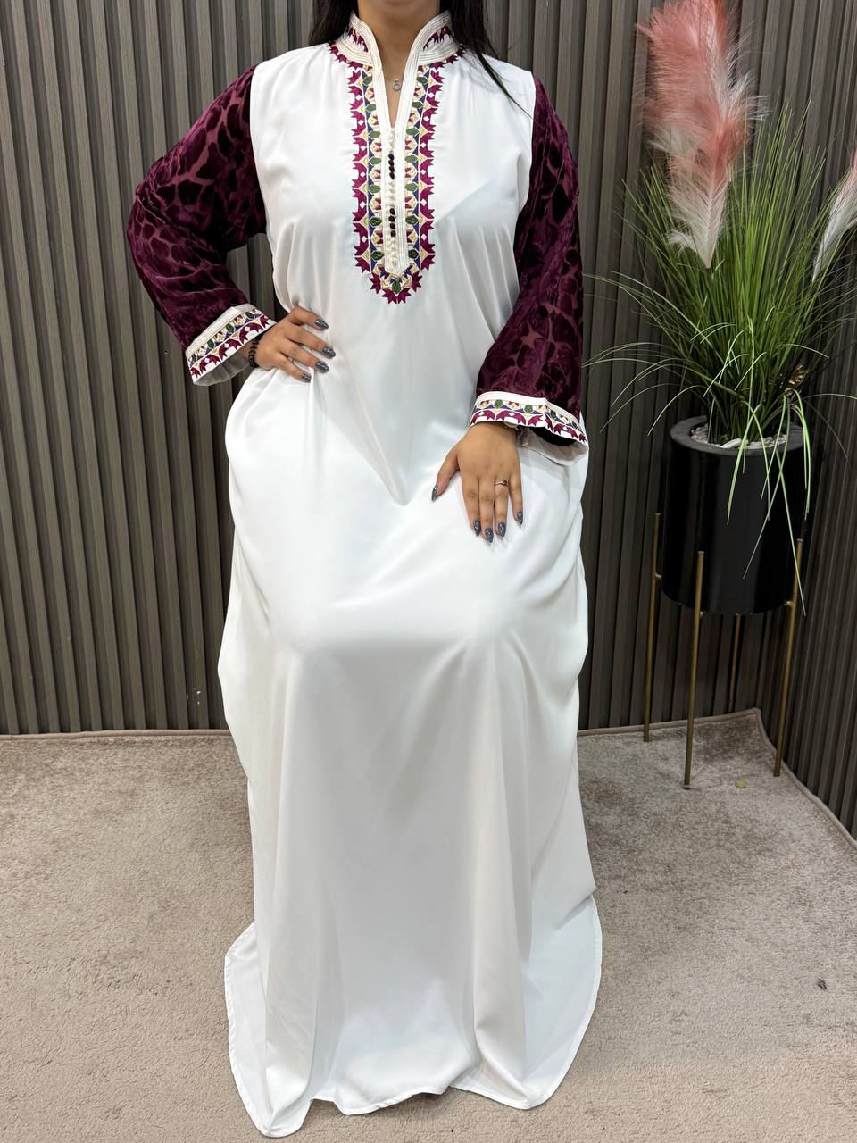 Deze prachtige kandora straalt pure klasse en verfijning uit. Ontworpen met traditionele tlija mouwen, die zorgen voor een luxueuze en sierlijke uitstraling. De fijne afwerking en vloeiende stof geven de jurk een elegante pasvorm die zowel comfortabel als stijlvol is.