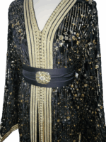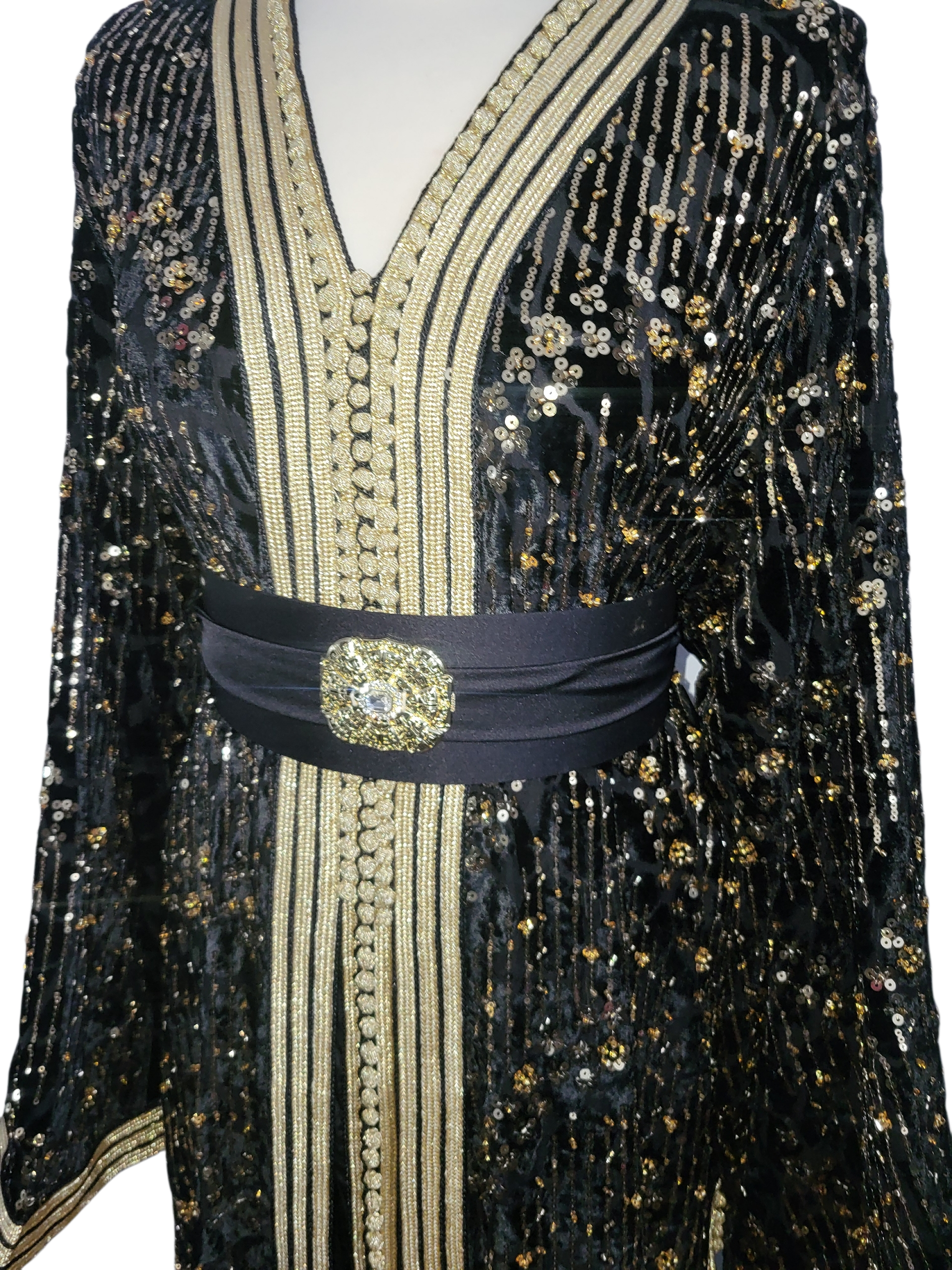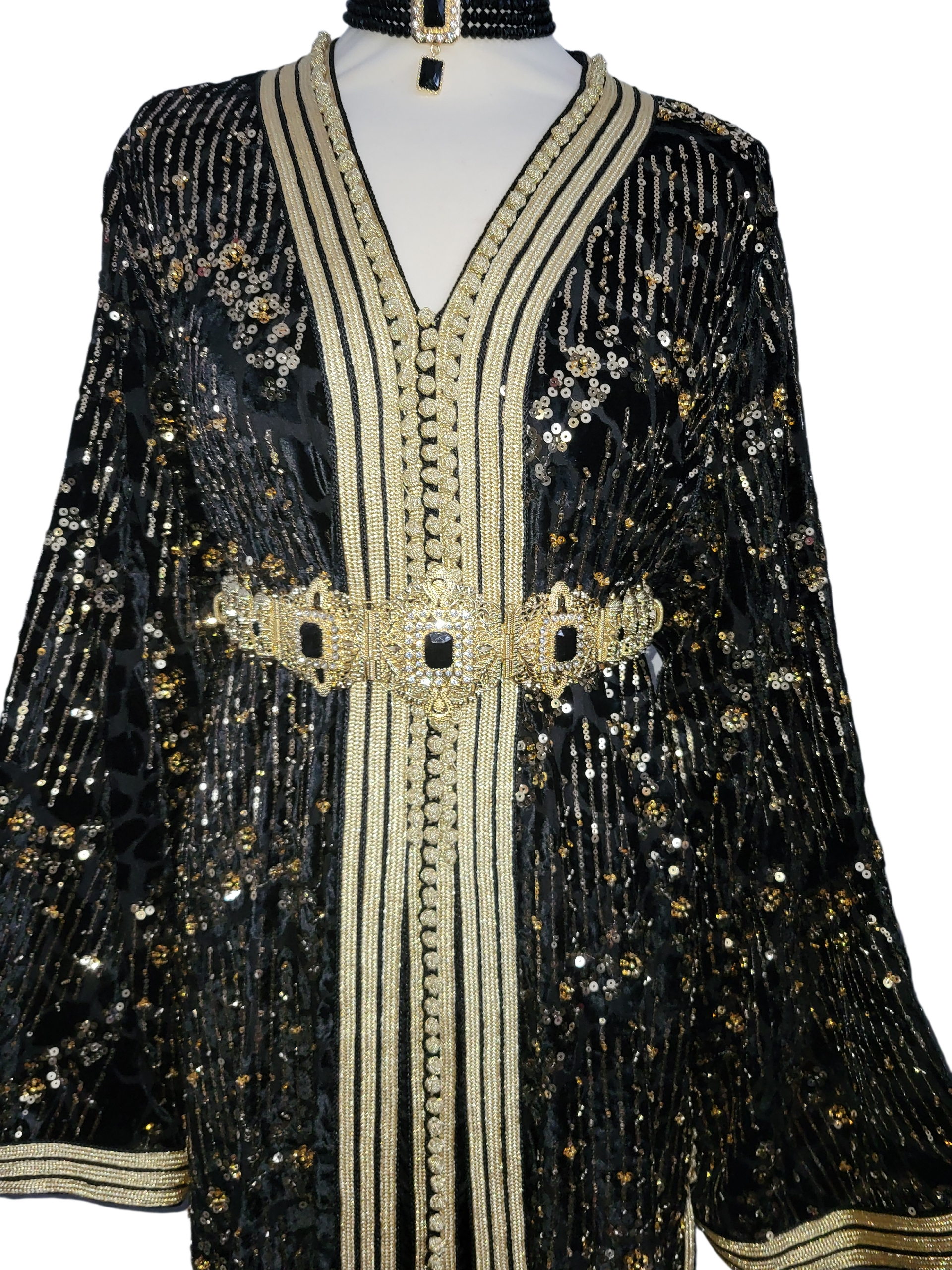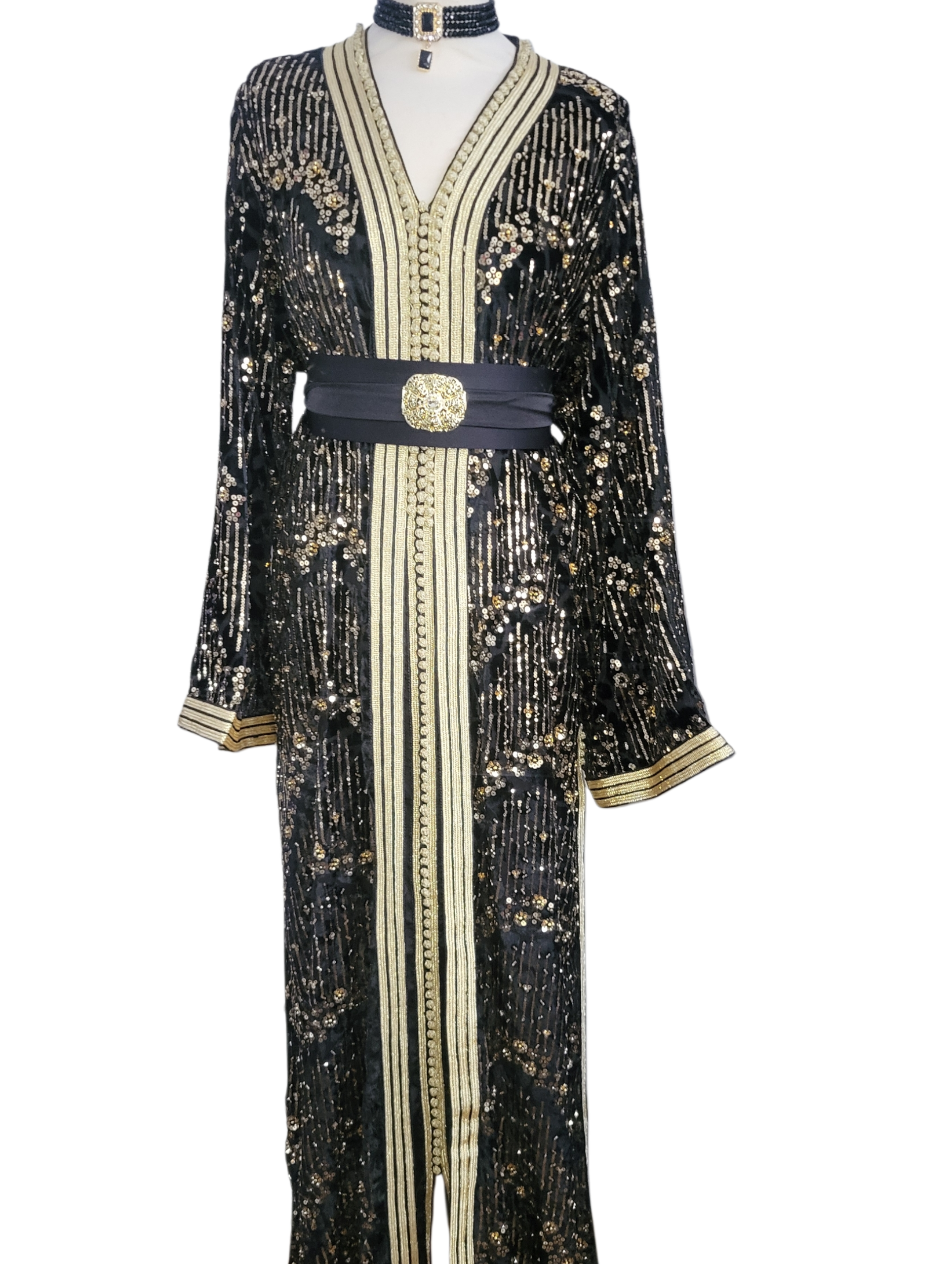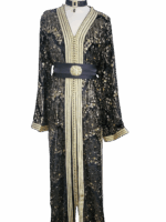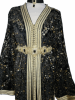 Deze zwarte Marokkaanse jurk van verfijnde mobra-stof straalt pure klasse uit. Rijk versierd met fonkelende pailletten en met de hand aangebrachte kraaltjes, vangt de jurk het licht bij elke beweging. Een tijdloos silhouet dat traditie en elegantie moeiteloos samenbrengt — perfect voor speciale gelegenheden.