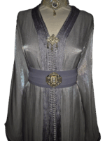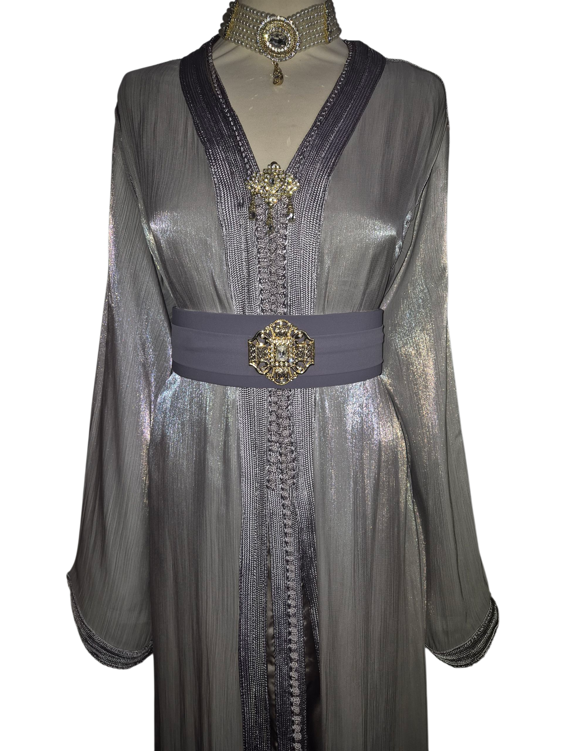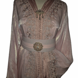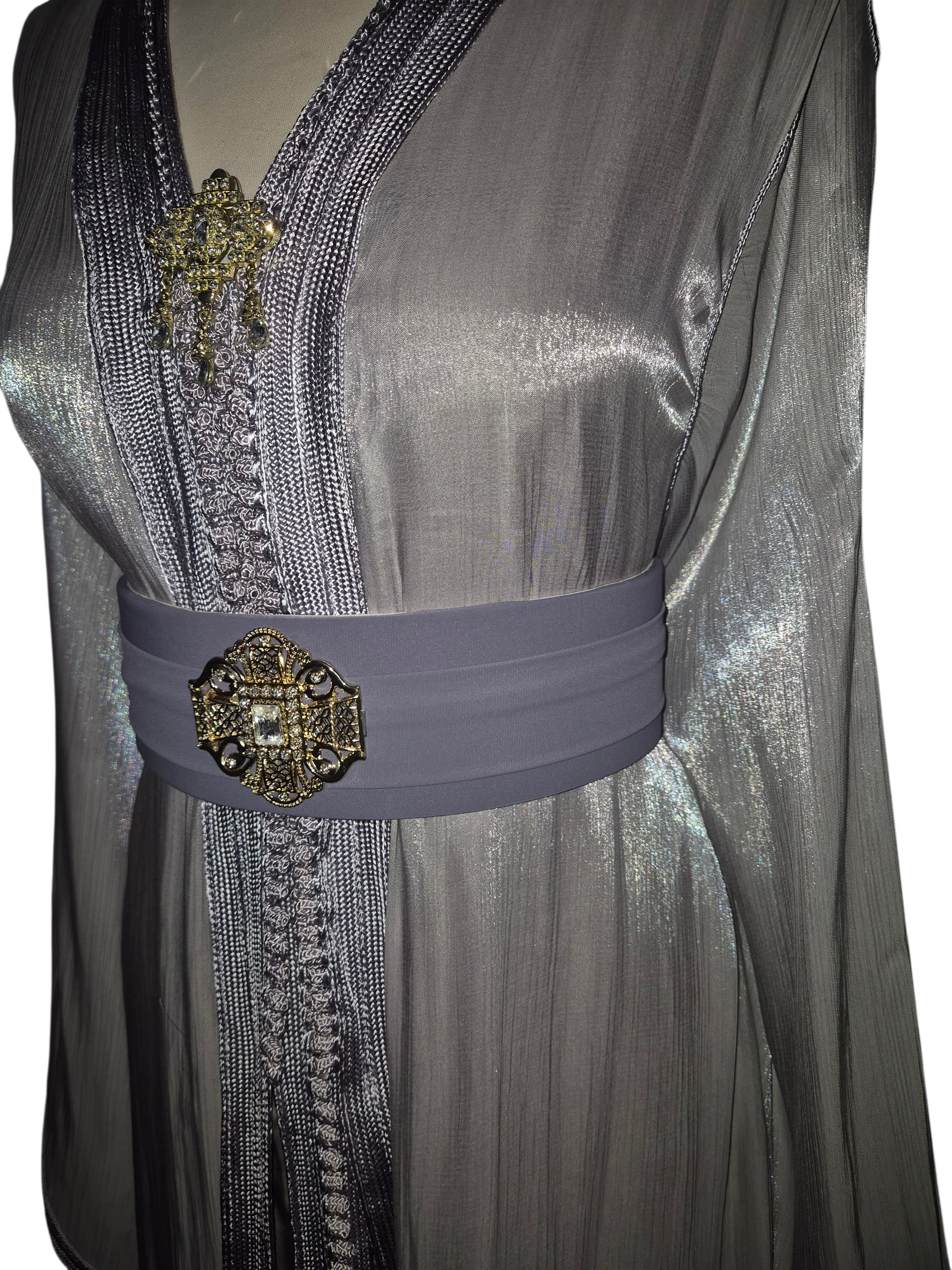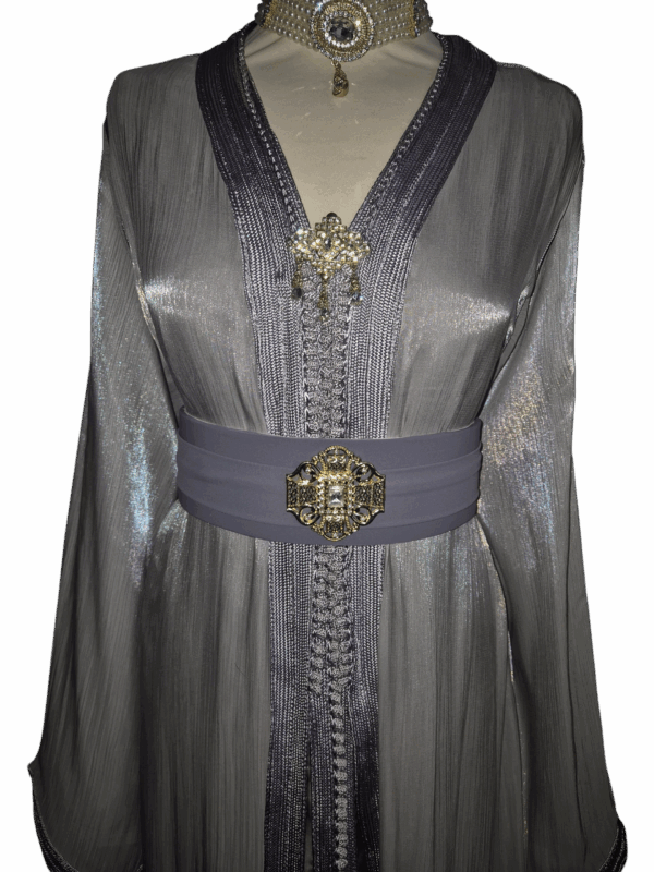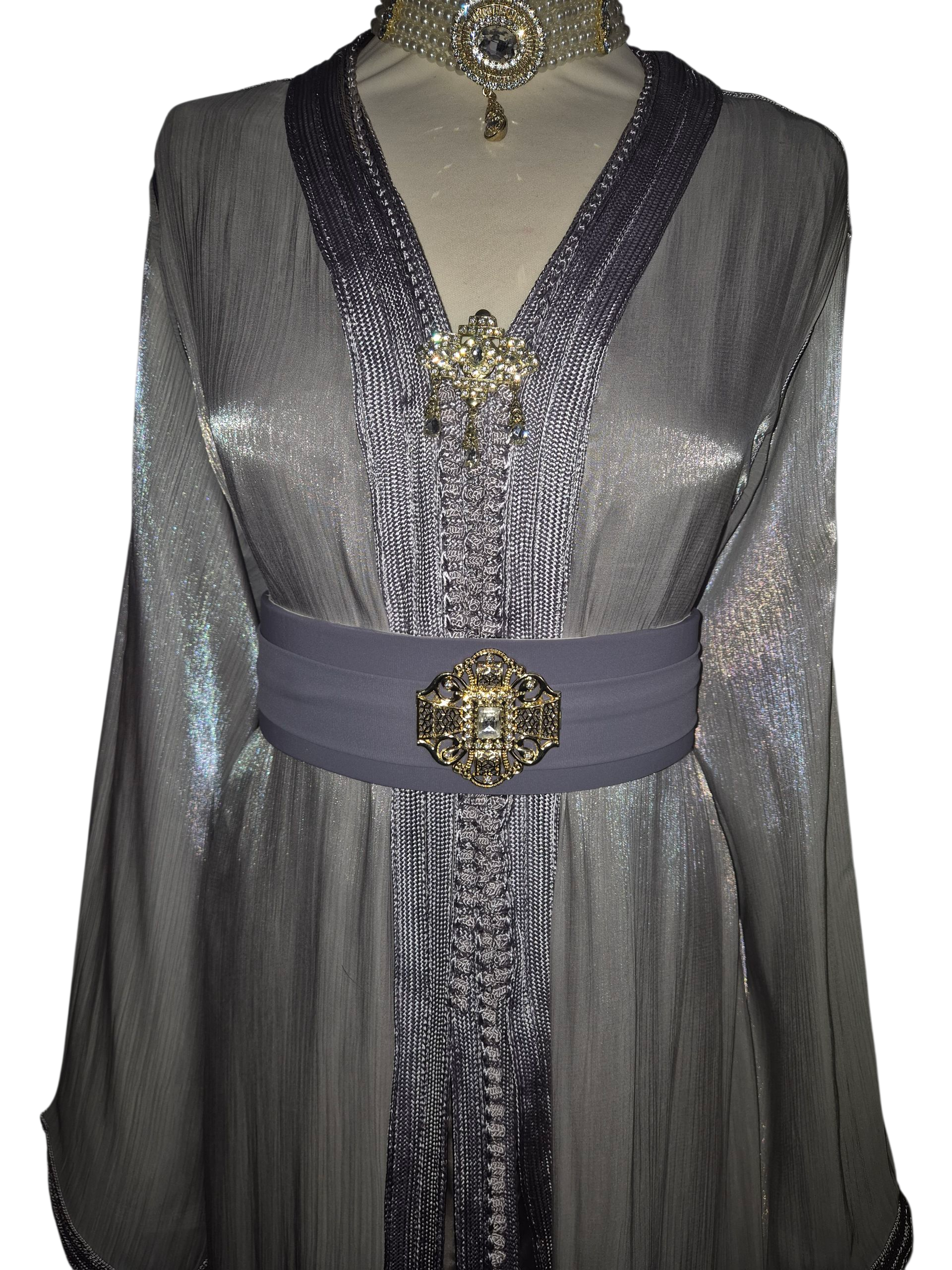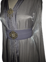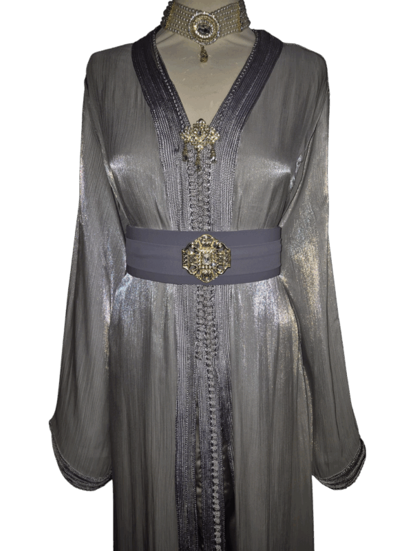 Laat je betoveren door de elegantie van deze prachtige Marokkaanse jurk, gemaakt van luchtige organza. De delicate stof vangt het licht op een unieke manier en geeft je een koninklijke uitstraling.